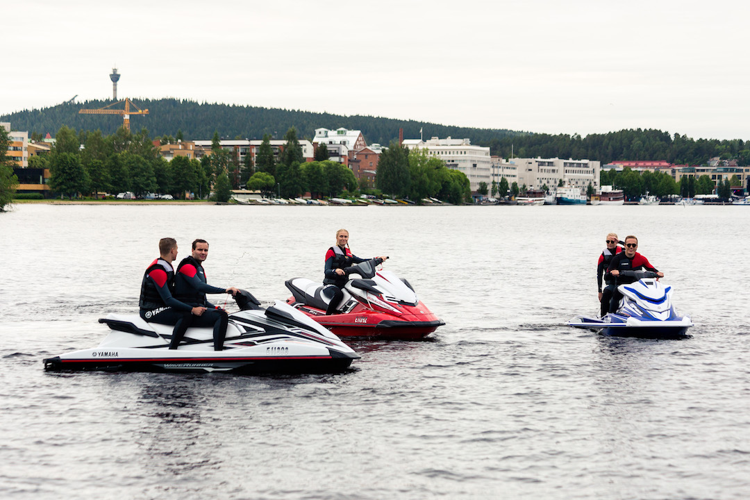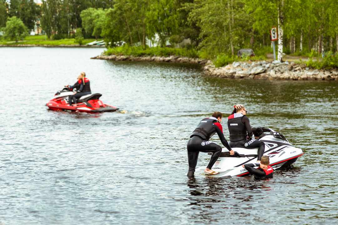 Heti alkuun saimme pienen perehdytyksen jetillä ajoon, siitä kuinka jettiä ohjataan ja kuinka esimerkiksi RiDE-järjestelmän ansiosta jetillä voidaan jarruttaa ja peruuttaa, mikä lisääkin ajoturvallisuutta huomattavasti! Muutamat meistä olivat ennestään kertaalleen päässeet kokeilemaan jetillä ajoa, mutta sen suurempaa kokemusta kenelläkään ei ollut.