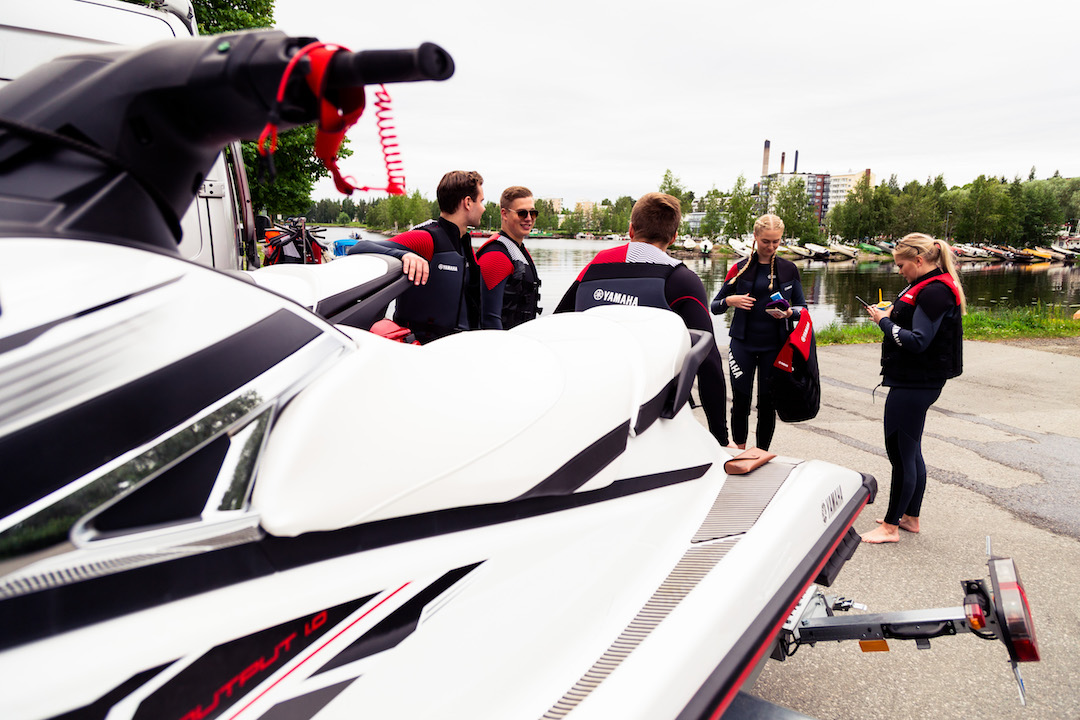 Ilmassa oli selkeästi aistittavissa innostunutta jännitystä, kun saavuimme rantaan, jossa jetit jo odottivat vesillelaskua. Meille oli auennut tilaisuus päästä koeajamaan kolmea Yamahan jettiä hyvällä kaveriporukalla, eikä kenelläkään ollut vaikeuksia tyhjentää kalenteriaan tältä illalta.