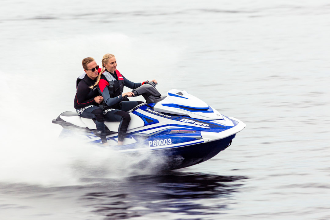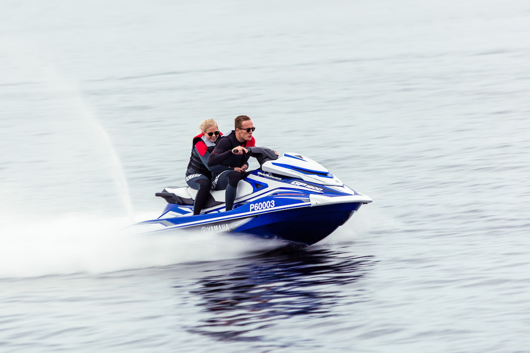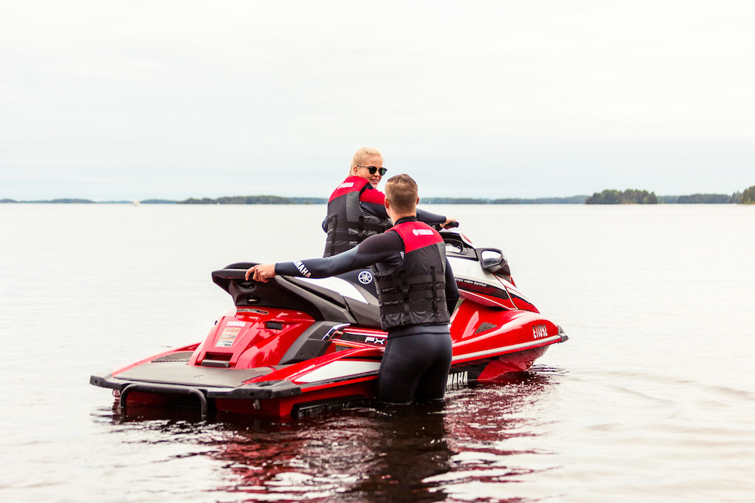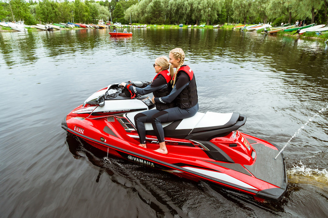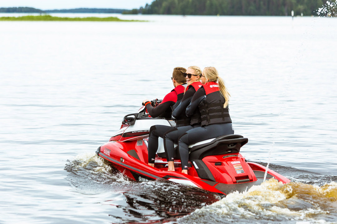 Koeajoon saamamme jetit olivat Yamahan VX Deluxe, FX SVHO sekä huipputehokas GP1800, jotka kaikki olivat rekisteröityjä kolmelle hengelle. Tietenkin herrasmiehinä annoimme tyttöjen harjoitella tehokkaammalla jetillä, mutta tämä ei osoittautunut toimivaksi ratkaisuksi, sillä VX Deluxe ei ehkä ole tarkoitettu kolmelle raavaalle miehelle ja niinpä tulimme kokeilleeksi Kallaveden lämpötilaa jo heti alkumetreillä. Onneksi tällaisen kömmähdyksen sattuessa jetteihin oli helppo kavuta takaisin kyytiin takaosan uimaportaan ansiosta. Tässä kohtaa kiitimme märkäpukujen olemassaoloa, mutta jetillä voisi yhtä hyvin ajaa myös normaaleilla vaatteilla pienellä varauksella.
