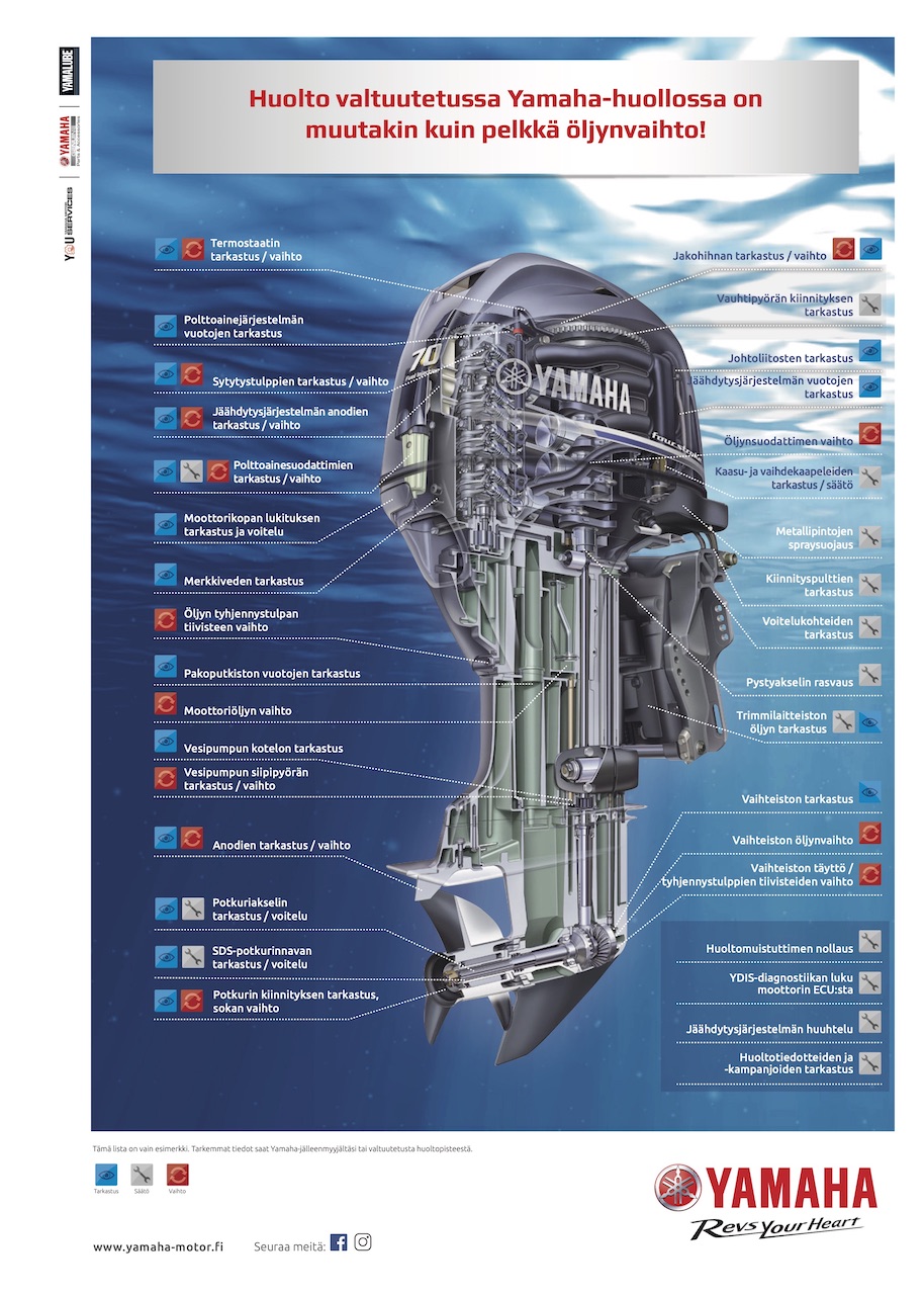 Yamahan perämoottoreiden huoltoväli on 100 tuntia tai kerran kaudessa. Syksyllä tehdyt huoltotoimenpiteet varmistavat moottorin moitteettoman toiminnan kevään ensikäynnistyksen yhteydessä.