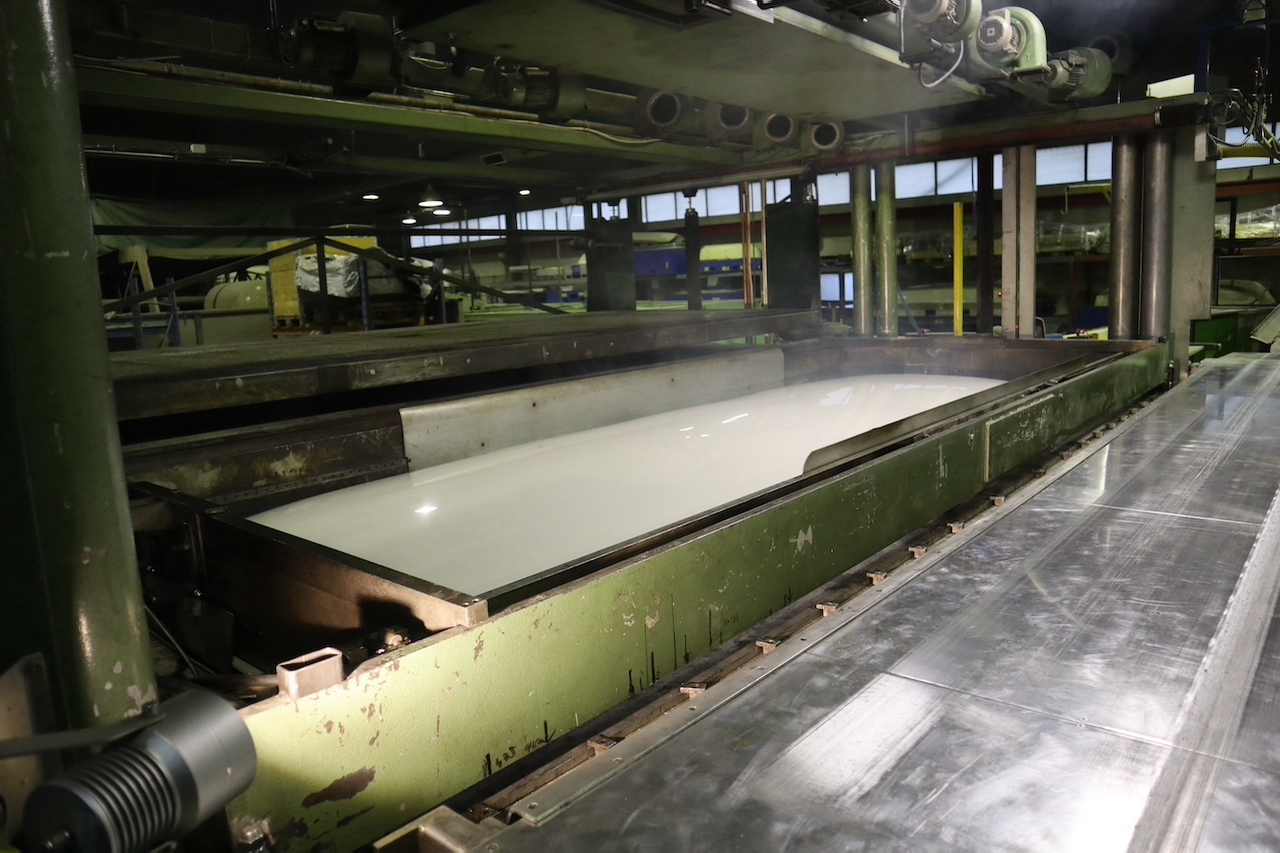 Kaikki tapahtuu hetkessä – näyttää kuin veneen pohjan muodot kohoaisivat maidosta, kun valkoinen muovi muovautuu vähitellen veneen pohjaosaksi. Muotoonsa jäähtynyt osa siirtyy käsin viimeisteltäväksi, samalla kun koneisto nostaa uuden levyn uuniin lämmitettäväksi.