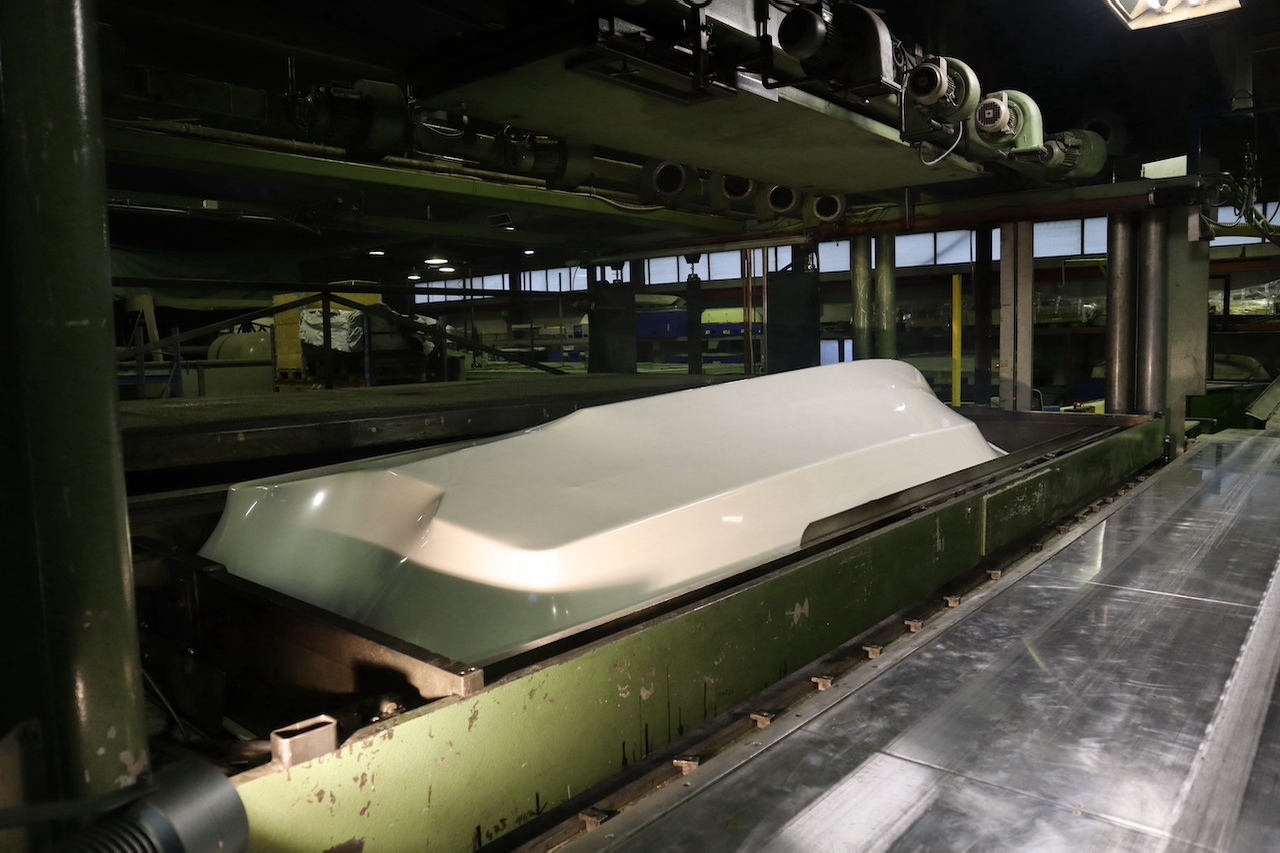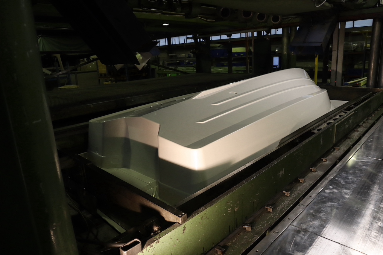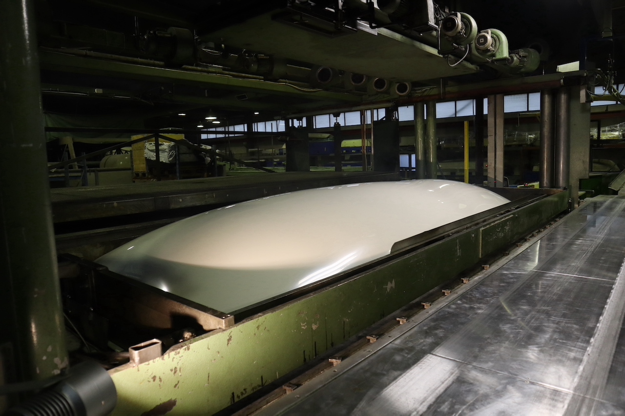 Vahvarakenteinen ABS-muovilevy lämmitetään ensin valtavassa uunissa 190-asteiseksi, mikä vie aikaa vain muutaman minuutin. Tämän jälkeen pehmennyt muovi asettuu alumiinisen muotin päälle, samalla kun kone imee ilman pois muotin ja muovin välistä.
