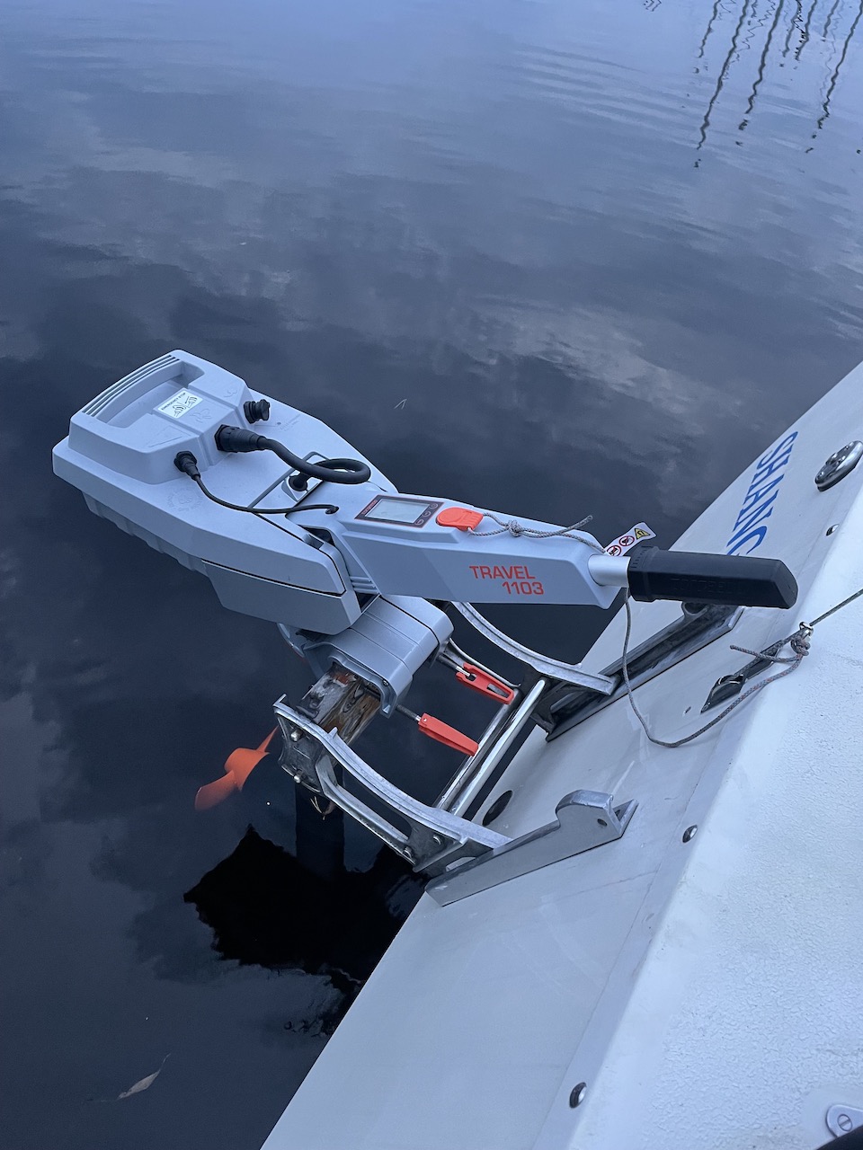 Torqeedo sähköperämoottori on modulaarinen. Siinä kahva, akku ja riki ovat irrotettavissa toisistaan. Akku painaa kuusi kiloa ja riki reilut yksitoista. Moottori on helppo irrottaa veneestä kokonaisena tai osissa ja siirtää toiseen veneeseen aina tarvittaessa. Painavaa bensaperämoottoria ei tee mieli irrottaa telineestään ennen kuin kauden lopuksi.