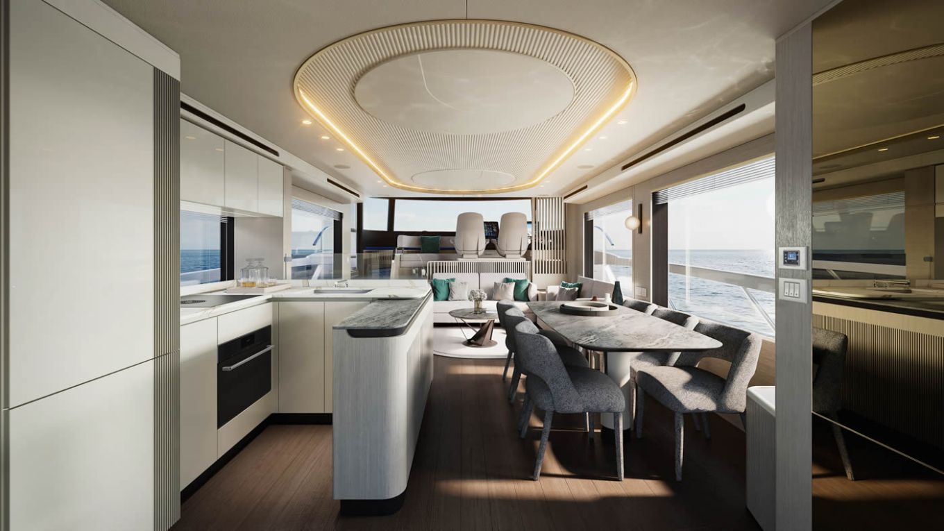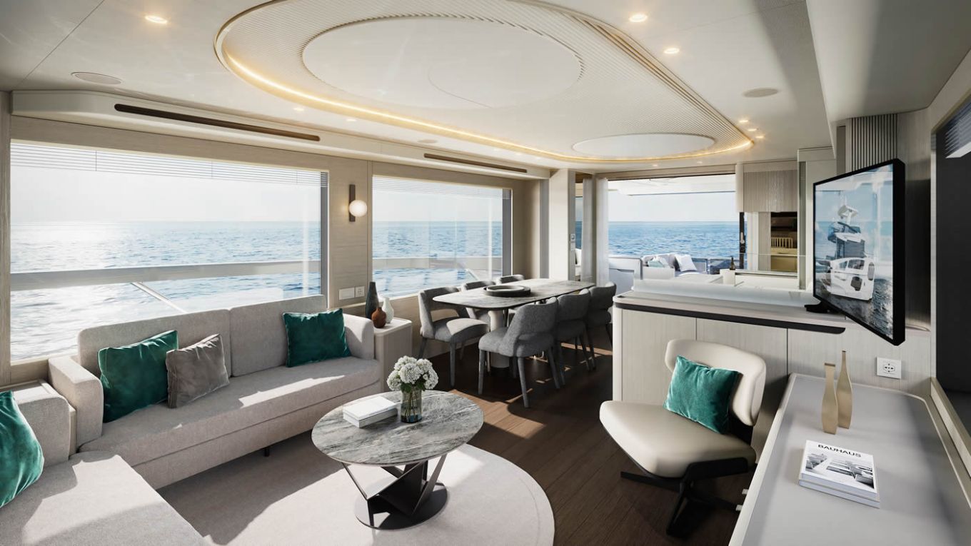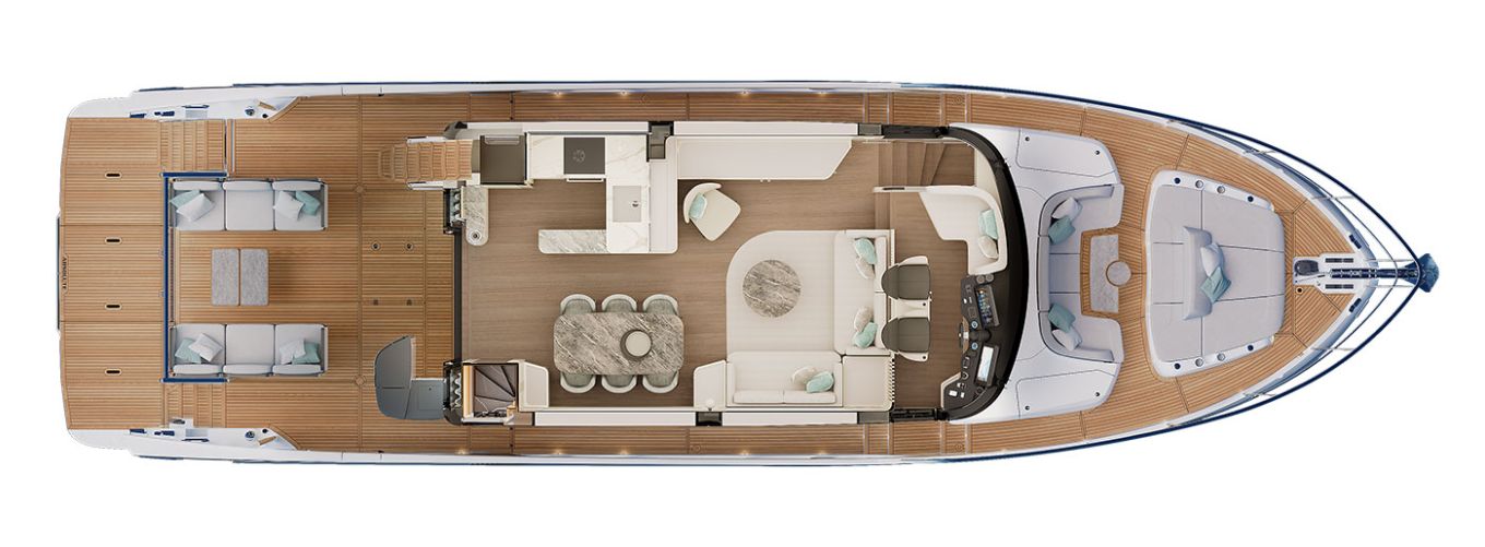 Flybridgen alapuollle oleva kansisalonki on hiukan vastaava kokonaisuus, johon kuuluu olohuonemainen salonki, kuuden hengen kattauksen mahdollistava ruokailutila sekä kookas U-pentteri. Sisäohjaamo on pari askelmaa kansisalonkia ylempänä.