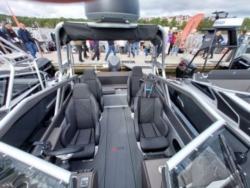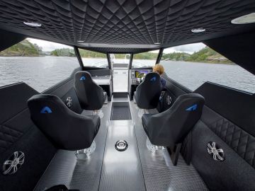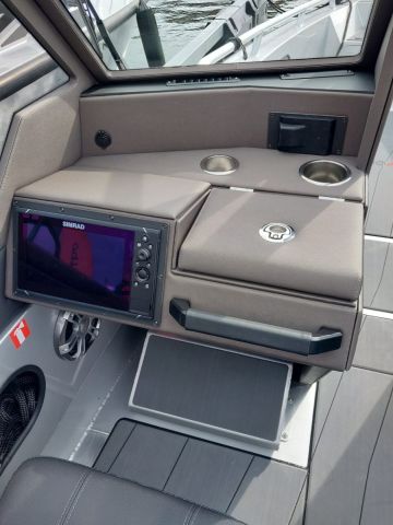 Vakiovarustukseen kuuluva kattava elektroniikkapaketti pitää sisällään muun muassa tutkan ja apukuskin pulpetin lisänäytön. Kuskia hemmotellaan lisäksi lämmitettävällä ohjauspyörällä. Se on hyödyllinen talvivaruste autoissakin, joten tuntuu koleissa kevät- ja syyskeleissä veneillessäkin varmasti mukavalta. Voi vain ihmetellä, ettei varuste ei ole yleistynyt avoveneissä jo aikaisemmin.