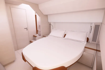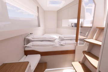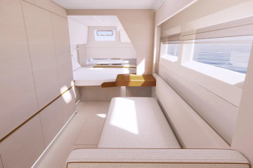 Sisällä Aquila sekä noudattelee perinteitä, että luo uusia linjoja. Tuttua on useiden vaihtoehtojen tarjonta, kun tilaa on runsaasti käytössä. Vakiona toinen runko, tällä kertaa paapuurin puoleinen, varataan omistajien käyttöön. Silloin perään sijoittuu suuri makuukajuutta, keskiveneeseen työskentely- ja oleskelutilat sekä keulanpuolelle wc, kylpyhuone ja suihkutila kukin omana yksikkönään. Aivan keulaan tulee vielä varasto tai verstas omalla kulkutiellään.