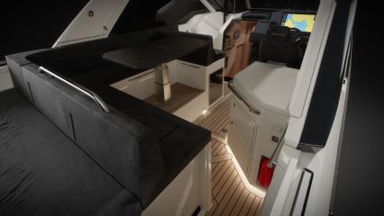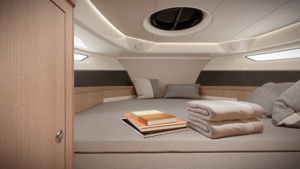 Lisää ulko-oleskelutilaa löytyy keulakannelta, jonka syvennykseen on aseteltu muhkea kolmen hengen selkä- ja kyynärnojallinen divaani. Tuulilasin läpikulku on järjestetty sujuvan oloisesti paapuurin laidalle.