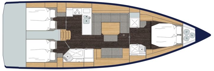 Kummassakin veneessä on vakiona kolme kajuuttaa, omistajan hytti keulassa ja pari pienempää takana. Charterkäyttöä varten keulaankin saa kaksi hyttiä ja tarvittaessa vielä kaksi punkkaa salongin kohdalle laidalle.