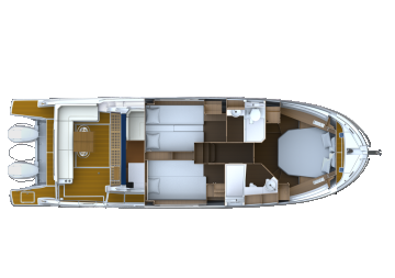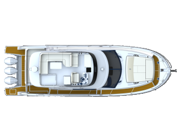 Tilat ovat monipuoliset. Ulkoa löytyy modattava oleskelutila sekä keula- että peräkannelta. Keulassa oleilu on luonteeltaan rennompaa loikoilua, perässä voi kokoontua pöydän ääreen illallisellekin. Kolmas ulkotilakokonaisuus on yläkannella eli flybridgellä. Yläohjaamon lisäksi siellä on pentterikaappi sekä kookas U-sohva.