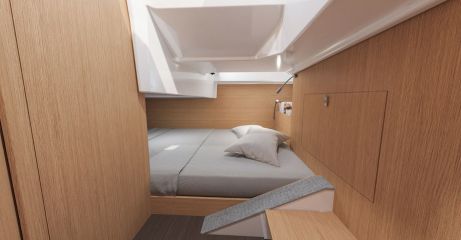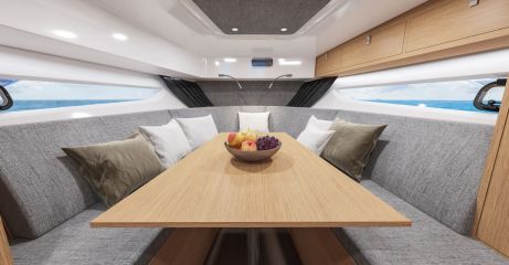 Kannen alta löytyy keulasta kookas u-sohva, erillisellä suihkukomerolla varustettu toiletti sekä parivuoteellinen makuukajuutta. Keulasohvan saa muutettua toiseksi parivuoteeksi, joten yönsija löytyy neljälle.