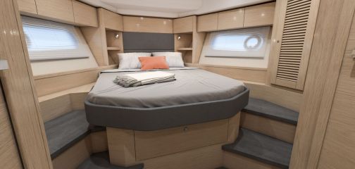 Omistajan kajuutta on keulassa, ja varustettu erillisellä wc- ja suihkuhuoneilla. Keskiveneessä on rinnakkain kaksi makuukajuuttaa, joiden kummankin vuoderatkaisun voi muokata erillisvuoteista parivuoteeksi. Satunnaisvieraille voi pedata salongin vuodesohvan.
