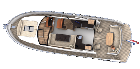 Sisätilojen tilaratkaisu on nykyaikaisille cabincruisereille tyypillinen. Veneen molemmille laidoille levittyvä pentteri on kansisalongin takareunassa, josta tarjoilu sujuu yhtä hyvin avotilaan kuin kansisalongin u-sohvalle. Sen etureunan selkänoja on taittuva, joten sohvan etupäätyyn muodostuu matkan ajaksi kasvot ajosuuntaan istuttava apukuskin paikka.