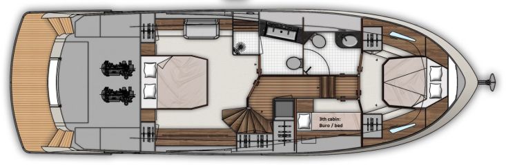 Majoituskannen ja kansisalongin välinen portaikko on sijoitettu poikkeuksellisesti mutta onnistuneelta vaikuttavasti styyrpuurin laidalle ohjaamon ja pentterin väliin. Monista nykyisistä cabincruisereista poiketen ohjaamossa ei ole sivukannelle johtavaa liukuovea.