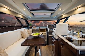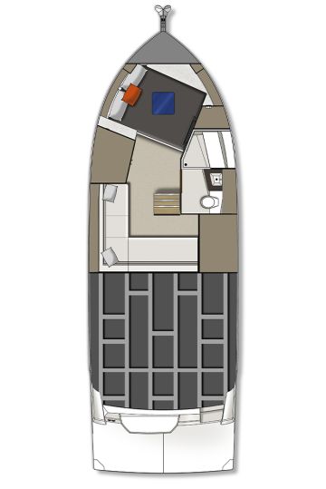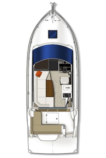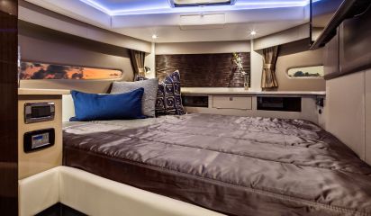 Omistajaparin vuode on keulassa ja alakerran oleskelutila ohjaamon alla keskiveneessä. Sen kulmasohva muuntuu täysimittaiseksi parivuoteeksi. Yksityisyyttä löytyy lisävarustelistalta liukuovellisen laipion verran.