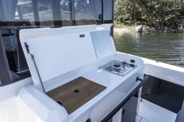 Turkki on vakiona liukuestokarhennettua lujitemuovia, mutta pinnoitteeksi voi valita massiivitiikkiä, synteettistä Estheciä tai pehmeää SeaDekiä. Navigointielektroniikkavaihtoehdot tulevat Garminilta.