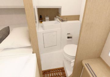 Kipparin ja kartturin erillisistuimet on sijoitettu ohjaamoon vierekkäin. Lisävarusteena niiden ja takapenkin väliin saa pöydän ja vuodemahdollisuuden. Kaulakajuutassa on vakiona parivuode ja wc-tila. Vesi-wc septitankkeineen sekä makeavesijärjestelmä pesualtaineen ja tankkeineen valitaan mukaan lisävarustelistalta.