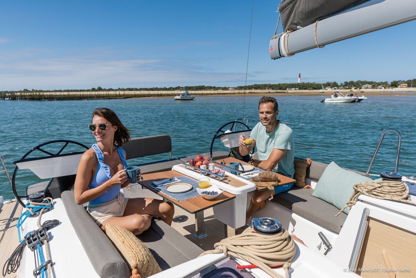 Veneen ulkotilat ovat tämän kokoiseksi veneeksi varsin hulppeat, istumakaukaloon mahtuu isompikin porukka. Dufouriin on saatavilla myös ilmatäytteinen auringonottotaso veneen taakse.