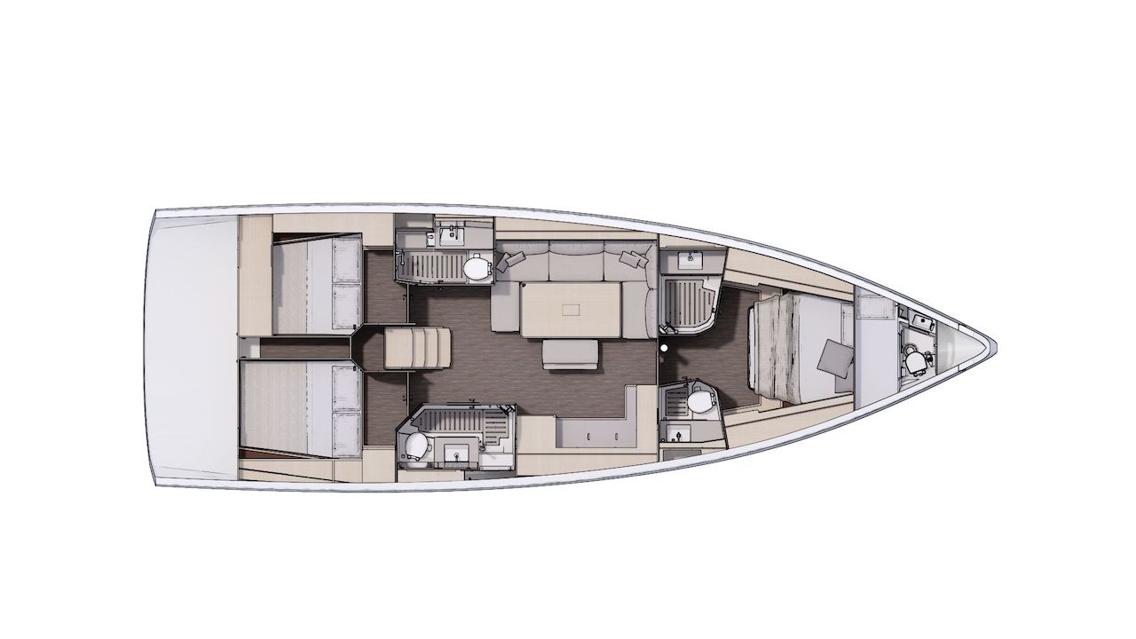 Sisustusta saa neljänä eri versiona. Kiitos veneen suuren kuutiotilavuuden, suunnittelijoilla on ollut tavanomaista enemmän vapauksia pohjapiirustusta tehdessä. Perusversiossa on kolme tuplakajuuttaa ja suihku/wc-tilat jokaiselle kabiinille. Charter-version saa joko viidellä kajuutalla ja kahdella wc:llä tai neljällä hytillä ja yhtä monella saniteettitilalla. Näissä malleissa pentteri on veneen sivun myötäisesti vastapäätä oleskelutilaa. Neljännessä versiossa on kolme tuplakajuuttaa ja kaksi wc:tä ja pentteri on sijoitettu oleskelutilan etupuolelle. Kaikissa verisoissa on myös yhden hengen miehistötila ankkuriboksin takana. Samaan tilaan on integroitu kipparin oma wc, joten mistään varsinaisesta kapteeninhytistä ei ole kyse.