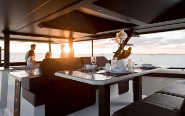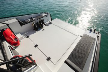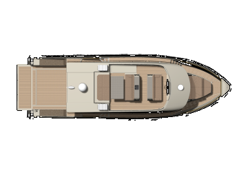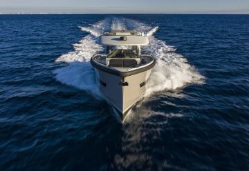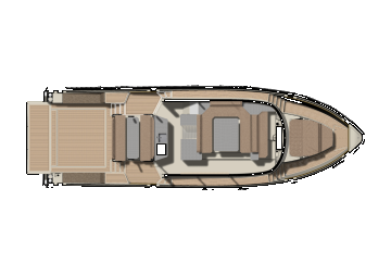 Ohjaamo on melko keulassa, vaikka toki tuulilasin etupuolelle mahtuu laaja aurinkotaso. Oleskelutilat ovat keskiveneessä ja perässä on valtava ja monikäyttöinen ulkokansi, jonka alla ja sivuilla ennennäkemättömän kookkaat ja monipuoliset varastot ja säilytystilat.