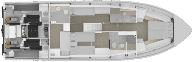 Veneessä on kolme kantta, joista alin on kolmen toiletin ja 6–8 makuupaikan majoituskansi. Pääkansi voi olla valinnan mukaan joko sivuilta ja perästä avoin (Open) tai suljettu (Cabin).