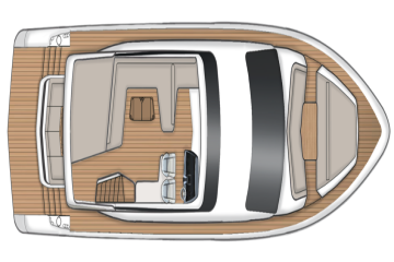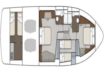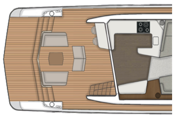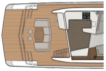 Pääkansi on järjestetty nykytyylin mukaisesti siten, että tilava pentteri on takana ja salonki edessä. Majoituskannelta löytyy kolme makuukajuuttaa sekä kaksi toilettia. Mastersviitti on keskiveneessä. Konehuoneen takana peräkannen alla on tilavalta ja siten myös vieraskelpoiselta vaikuttava miehistöhytti, jonne kuljetaan uimatasolta.