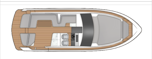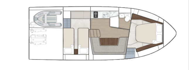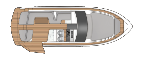 Ohjaamon on sovitettu kaksi erillisistuinta ja niiden taakse poikittain pentterikaappi. Ohjaamon vieressä toisella laidalla on mukavanoloinen minilounge. Keulakannelta löytyy iso ja tasainen aurinkotaso, joka etupäädyssä on jalkatilasyvennyksellä varustettu sohva.