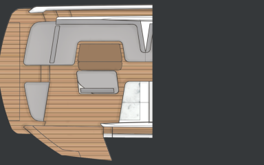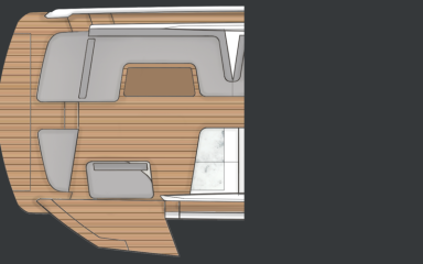 Tilaratkaisun kannalta suurin mielenkiinto kohdistuu kookkaaseen paapuurin laidalle sijoitettuun peräsohvaan, johon kuuluu styyrpuurin laidalle liikuteltavissa oleva saareke. Mekanismia ei vielä sen tarkemmin avata. Pohjapiirroksen mukaan styyrpuurin puolelle on saatu mahtumaan myös apuvenetalli, johon Fairlinen mukaan mahtuu 2,3-metrinen kumppari ja sähköperämoottori.