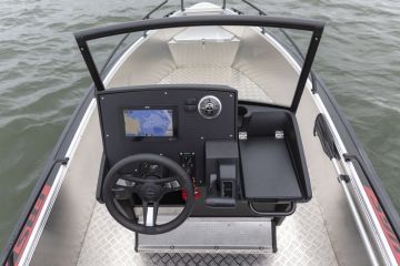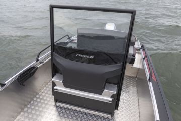 Pulpetissa on kookas kannellinen hansikaslokero ja hyvin tilaa vakiovarusteisiin kuuluvalle Raymarine Axiom+-karttaplotterille. Sulaketaulu ja päävirtakytkin on sijoitettu näppärästi käytettäväksi pulpetin laitaan. Uutta on myös pulpetin etukulmien askelmat, jotka helpottavat laitojen kautta rantaan kulkua. Pulpetin etureunassa on myös Fastereille tunnusomainen kisko, johon voi kiinnittää erilaisia irrotettavia kalusteita, kuten istuin-, köysi- tai ankkurilaatikoita.