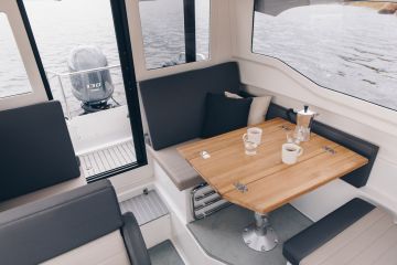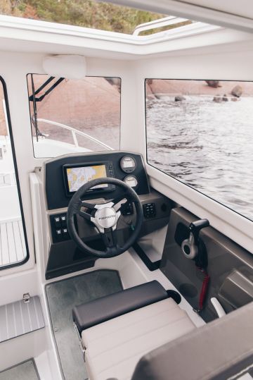 Hytti vaikuttaa kuuden metrin kokoluokka huomioiden tilavalta. Matka-ajoon on tarjolla neljä tai jopa viisi istumapaikkaa kasvot ajosuuntaan päin. Apukuskin penkin istumasuuntaa voi muuttaa kääntämällä selkänoja, jolloin paapuurin laidalle muodostuu kahden tai kolmenkin istuttava dinetti. Se on uniikki ominaisuus kuusimetristen ohjaushyttiveneiden kokoluokassa.