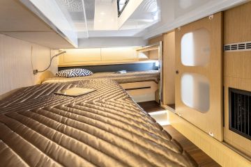 Ihan niin asia ei tietysti ole, sillä lasikatoksen myötä myös kannen kalustusta on vähän muokattu. Kolmen erillisistuimen ohjaamo on ennallaan, mutta Openissa takana poikittain oleva pentterimoduuli on Coupessa paapuurin laidalla pitkittäin. Styyrpuurin puolelle on jäänyt tilaa u-sohvalle.