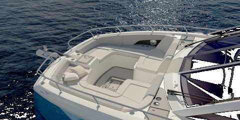 Ohjaamon takana on molemmille laidoille levittyvä ulkopentteri ja perässä yhteen tai erilleen liu’utettavat U-sohvan puolikkaat. Uimatasoja on kolme, joista suurin on keskimmäinen. Avattavaa laitaterassia ei ole, mutta kulkua helpottava laitaportti löytyy.