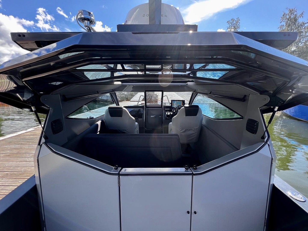 Keskihytin molemmilla puolilla on käyttökelpoiset avotilat. Molemmissa on toimivalta näyttävät kulkuyhteydet, jota taka-avotilan peräpeilittömyys vain korostaa. Moottorina on 300-hevosvoimainen Mercury V8, jolla varustettu huippunopeuden kerrotaan nousevan lähes 50 solmuun.