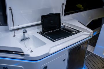 Keulan avotila on kansimuotin levennyksien ansiosta varmasti kokoluokan suurimpia. Mutta ei tilaa näyttäisi puuttuvan taka-avotilan kolmelle sivulle levittyvästä sohvaryhmästäkään. Peräsohvan selkänojat voi kääntää, joten istuskelu onnistuu sekä perän että keulan suuntaan Kookas pentteri on lähellä, paapuurin laidalla. Lisävarusteena sohvaryhmää voi täydentää korkealla aurinkokannella (7 040 €), joka ulottuu perämoottorien päälle.