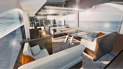 Keulakannella on tilava lounge, jonka sohvat ja pöydät säätyvät sopiviin asentoihin sähköllä. Keulakannelle pääsee kulkemaan sisäsalongista suoraan tuulilasiin sähköisesti avautuvan oven kautta.