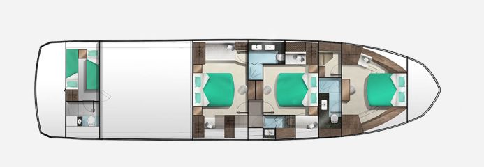 Kannen alla ja osin päälläkin mallipari jakaa samat tilaratkaisut ja niiden vaihtoehdot. Majoituskannen vakioratkaisuna on kolme varsin samankokoista kahden hengen sviittiä. Ne kaikki hyödyntävän neliöihinsä koko rungon leveyden ja on varustettu yksityisillä wc- ja suihkutiloilla. Keulimmaiseen makuukajuuttaan johtaa privaattiportaikko ja se on myös kooltaan hitusen muita suurempi, joten sitä voi sinänsä luontevasti tituleerata omistajanlukaaliksi.