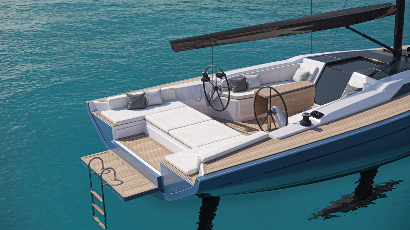 Jotta vene-esittely ei menisi aivan elinkaaren lopun kuvailuksi, voidaan GS Bluesta todeta, että se on vauhdikkaan ja hauskan näköinen pursi. Rungon latuska, mutta voimakkaasti muotoiltu ilme antaa vihjeitä vauhtipotentiaalista. Verraten edessä olevat tuplaruorit ovat selkeä merkki päiväpursitavoitteista, joista ehkä vielä enemmän kertoo kaavakuvien esittämä laaja auringonottotaso takakannella. Peräpeilistä saa tilauksesta aukitaitettavan uimatason.