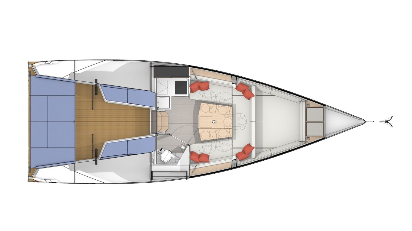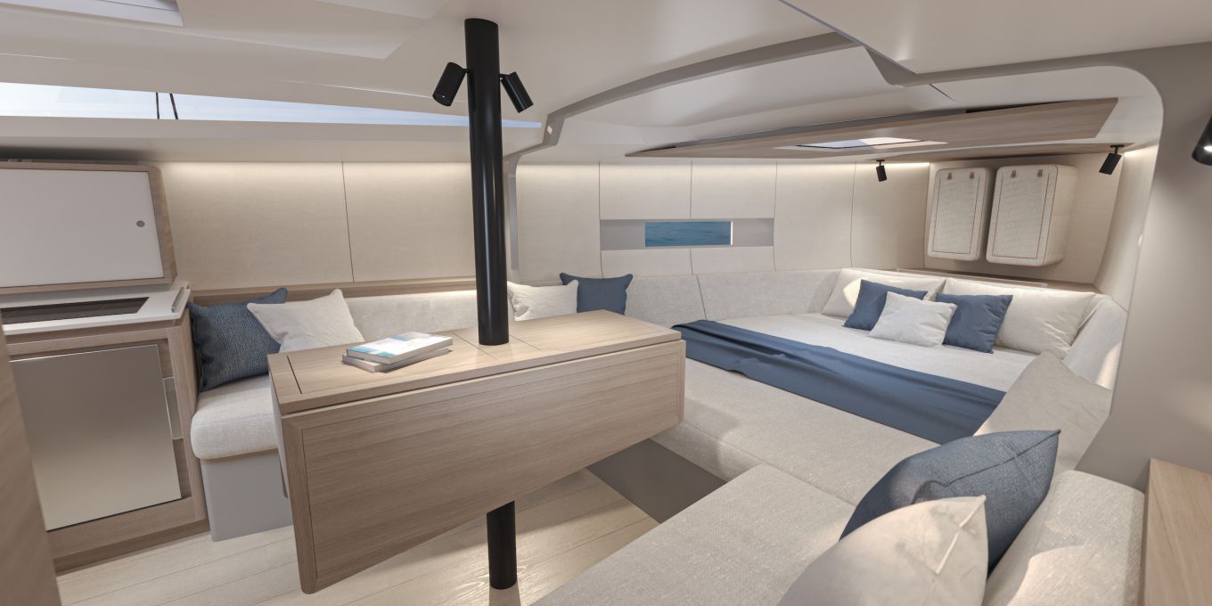 GS Bluessa on voimakas riki ja syvä 2,2 metrissä uiva T-köli. Fokka on itseskuuttaava ja takastaagin puute mahdollistaa lattapääison käytön. Grand Soleileille tyypillisesti veneen metrin mittainen puuksprööti on suhteessa varsin pitkä ja mahdollistaa erilaisten avotuulipurjeiden käytön. Veneeseen on suunniteltu sähköpropulsio, joka tekee Bluesta entistäkin ekologisemman. Siitä koska Bluesta tulee totta, ei italialaisveistämö hiisku vielä mitään.