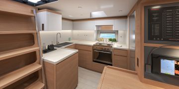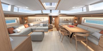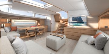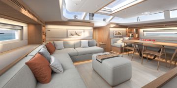 Portaikko sisälle on verrattain matala, sillä pääsalongin turkki on korkealla, kun painava tekniikka on sijoitettu tehokkaasti keskiveneeseen. Poikki veneen ulottuvassa salongissa on kaksi erillistä, sohva- ja pöytäryhmää. Toinen on ensisijaisesti ruokailupaikka, toinen divaaneineen ja mataline pöytineen sopiva iltacocktaileiden siemailuun.