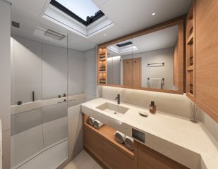 Salongista keulaan päin on vieraskajuutta kahdelle. Sen toiletti on yleiskäytössä muillekin matkustajille, mutta keulassa etummaisena olevassa omistajien sviitissä pesutilat ja kaksi suurta työpöytää ovat yksityiset.