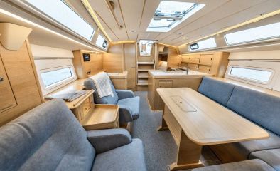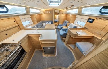 Salongissa runkoikkunat on sijoitettu korkeudelle, jossa ne parhaiten näyttävät maisemaa istuskellessa. Paapuurin laidalla on ruokailupöytä ja U-sohva, jonka pituus on yli kaksi metriä. Niin myös vastalaidan suoralla sohvalla, jonka saa vaihtaa kahteen nojatuoliin ja niiden välissä olevaan cocktail-pöytään. Ratkaisu on ollut suosittu Hallberg-Rassyn suuremmissa veneissä, ja nyt se tulee myös pienempään kokoluokkaan.