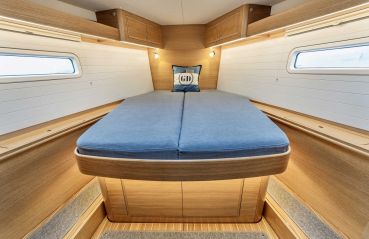 Omistajankajuutta on keulassa ja sen saa kahdella sisustusversiolla. Ensimmäisessä on tavanomaisesti laitoja myötäilevä V-vuode, toisessa helpommin noustava keskivuode laita-askelmilla. Molemmissa versioissa on samat kaapistot, työpöytätasot ja pukeutumispenkit päälaipiota vasten.