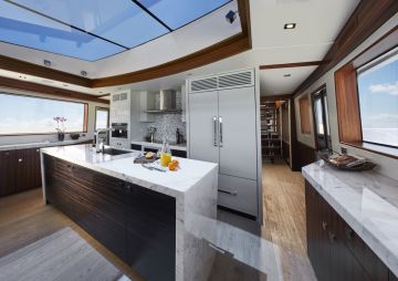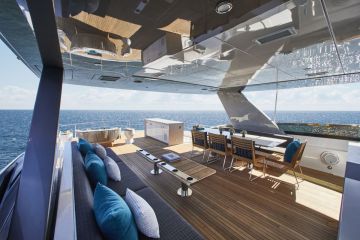 Ulkoilmaoleskeluun löytyy vaihtoehtoja hydrauliselta uimatasolta, perä- ja keulakannelta sekä luonnollisesti valtaisalta näyttävältä yläkannelta.