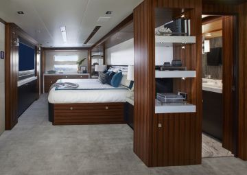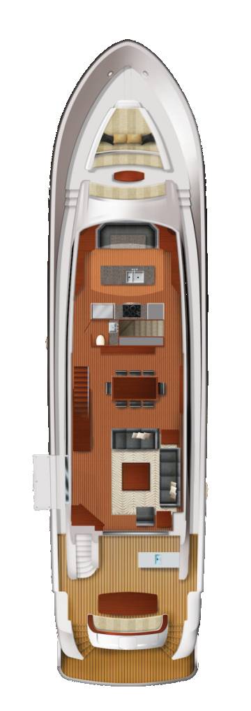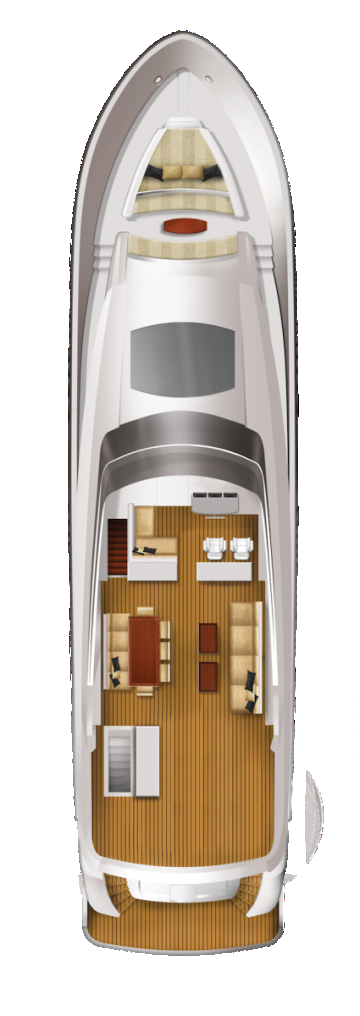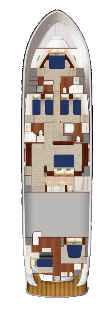 Ylimmässä kastissa on keskiveneessä koko rungon leveyttä hyödyntävä omistajan (tai vuokraajan) sviitti. Vip-kajuutta on keulassa ja kaksi "normaalia" vierashyttiä niiden välissä.