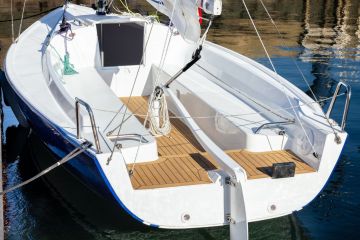 Ja siinä se sitten oikeastaan onkin. Yksinkertaisia purjehduspäiviä on tarjolla jopa viidelle hengelle, jotka mahtuvat yli 2,5 metriä pitkille penkeille. Kuudes mahtuu seisomaan avoimelle peräkannelle opettajaksi, sillä J/Boats näkee tällaiselle purrelle tilausta seurojen ja purjehduskoulujen harjoitusveneenä. Selkänojat ovat korkeahkot ja niiden reunukset kapeat, sillä vähän vanhanaikaiseen tapaan veneessä on tarkoitus pysyä niiden sisäpuolella. Laidoilla roikkumiseen ei ole tarvetta, joten edes mantookeja ei veneestä löydy.