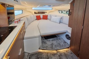 Ulkonäkö ja tilaratkaisu on ennallaan eli tarjolla on muhkea keulakannen loikoilupeti, korkealle nostettu kolmen hengen komentosilta, ulkopentteri ja perässä iso u-sohva. Avotilaa saa kattamaan tietysti t-topin ja paapuurin laidalle avattavan laitaterassin. Kannen alla on vuoteeksi pedattava salonki, sisäpentteri, keskikajuutta sekä väliseinällä ja ovella kuiva- ja märkätiloihin jaettu toiletti.