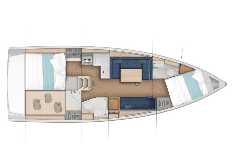 Sisätiloissa salongin sohvat on viety aivan laidoille, perinteisistä ylähyllyistä on luovuttu. Salonkiin valoa tuovat runkoikkunat sekä ruffin valoaukot. Keulakajuutassa on myös runkoikkunat. Venettä saa kahden tai kolmen kajuutan versiona yhdellä tai kahdella toiletilla varustettuna.