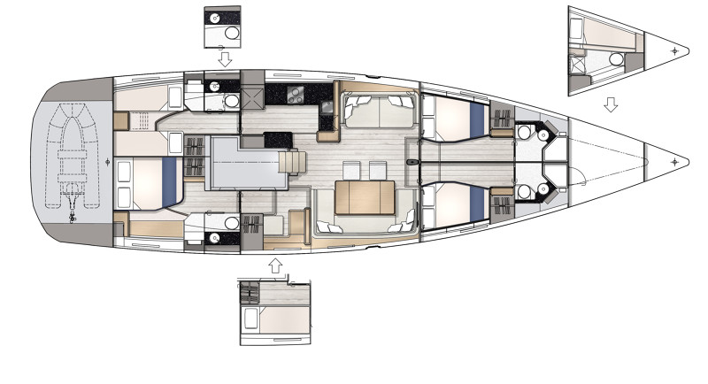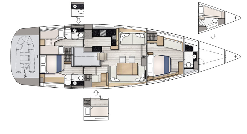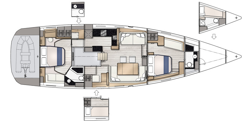 Sisätiloissa räätälöintimahdollisuudet on viety päätyyn saakka. Venettä saa minä tahansa versiona kahden kajuutan ja wc:n versiosta neljän makuuhytin ja wc:n vaihtoehdosta kuuden makuuhytin charter-versioon. Muutoin tilaa on salongissa yllin kyllin, ja myös keittiö on tilavampi kuin monessa kodissa.