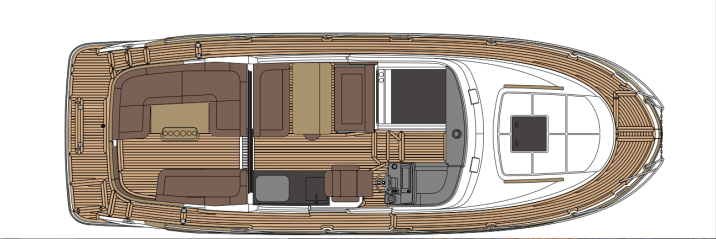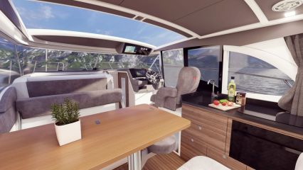 Oleskelu- ja matkustustilat on keskitetty kansitasolle. Sisäohjaamosta, pentteristä ja tilavalta vaikuttavasta dinetistä muodostuva kansisalonki on suljettavissa (tai avattavissa) isolla liukukattoluukulla ja liukuovella varustetulla lasisella takaseinällä. Dinetin etummaisessa sohvassa on taittuva selkänoja, mikä mahdollistaa kulkusuuntaan istumisen ajon aikana. Pöydän päädyssä näkyy kuvissa puolestaan näppärä taittojakkara.