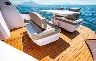 Perän avaran uimatason yläpuolella on veneen kokoluokkaan nähden iso aurinkopeti, joka avattuna muuttuu neljän hengen dinetiksi. Toki etukanneltakin löytyy aurinkopatjoja. Nämä puolestaan muuttuvat pystyasentoon nostettuina sohviksi ja seurustelutilaksi. Ohjaamon vieressä on ulkokeittiön virkaa toimittava wet bar.