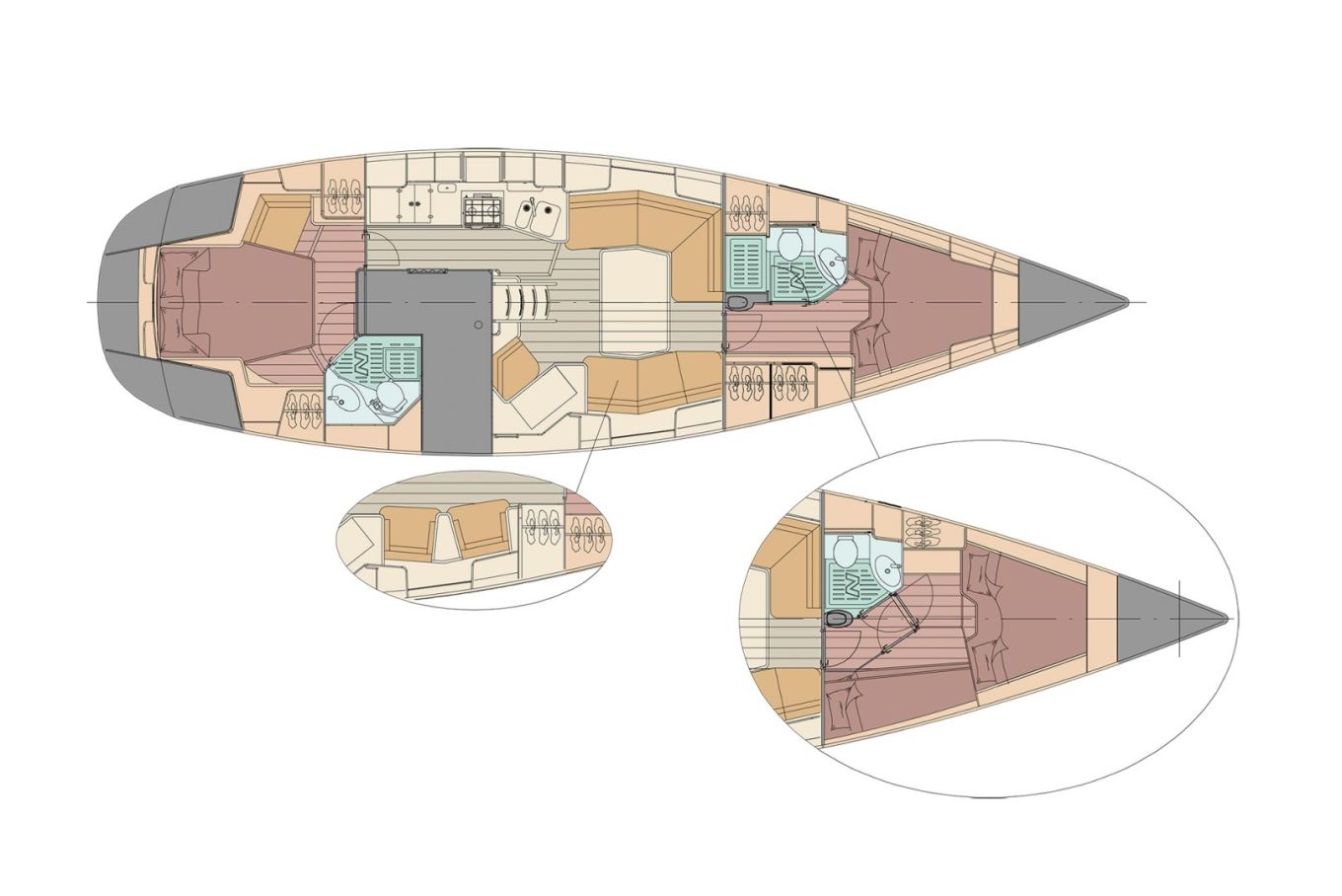 Najad 450 CC on lähtökohtaisesti pariskunnan vene ja mukaan mahtuu myös toinen hyvällä ja toimivalla ihmissuhteella varustettu pari. Omistajan takakajuutta parisänkyineen tarjoaa ruhtinaalliset tilat. Asiaan kuuluu riittävästi vaatesäilytystilaa ja oma en suite -kylppäri.